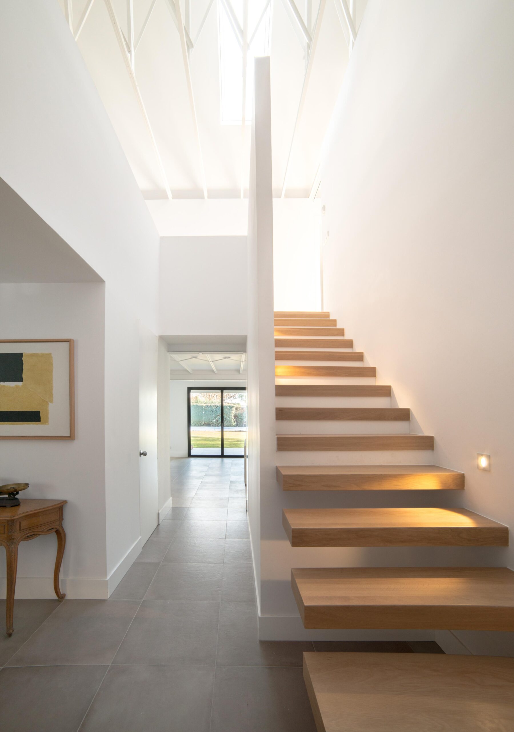 La rehabilitación interior es integral. Todo el volumen se desnuda, dejando al descubierto la estructura original metálica. Reubicamos la escalera y ampliamos la vivienda hacia el jardín en toda su longitud, y prolongamos la cubierta a dos aguas hasta completar el volumen para ganar dos habitaciones en planta primera.