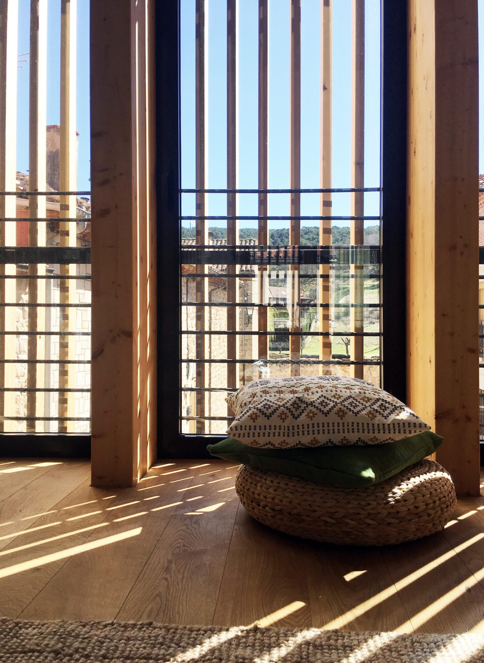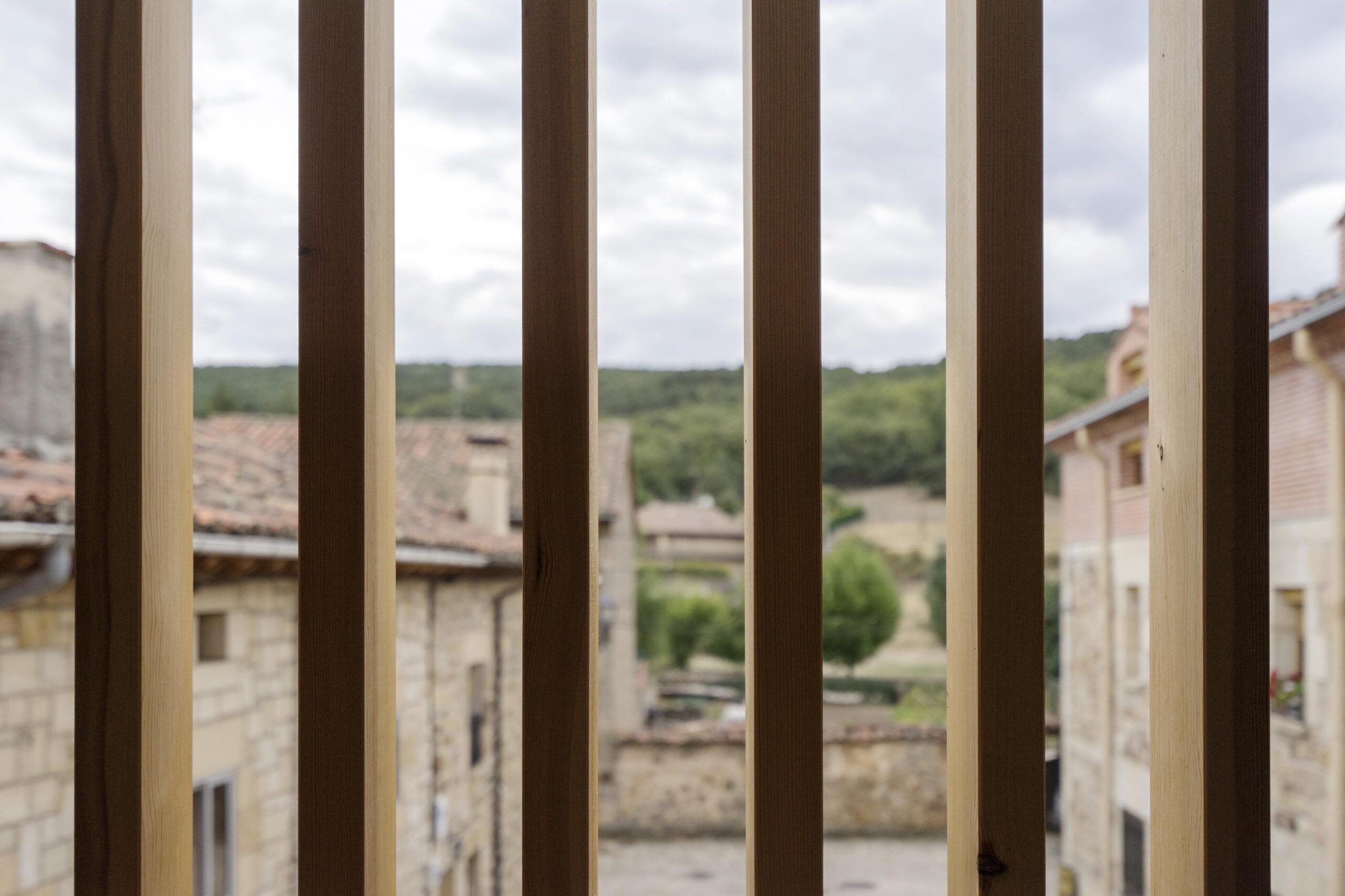 Para que el paisaje existente forme parte de la vivencia diaria de la casa, potenciamos intencionadamente la relación «dentro-fuera» de la vivienda mediante una celosía de madera que funciona como una segunda piel. Ésta es protagonista en las dos fachadas longitudinales de la vivienda y se abre o se cierra según las necesidades de cada estancia.
