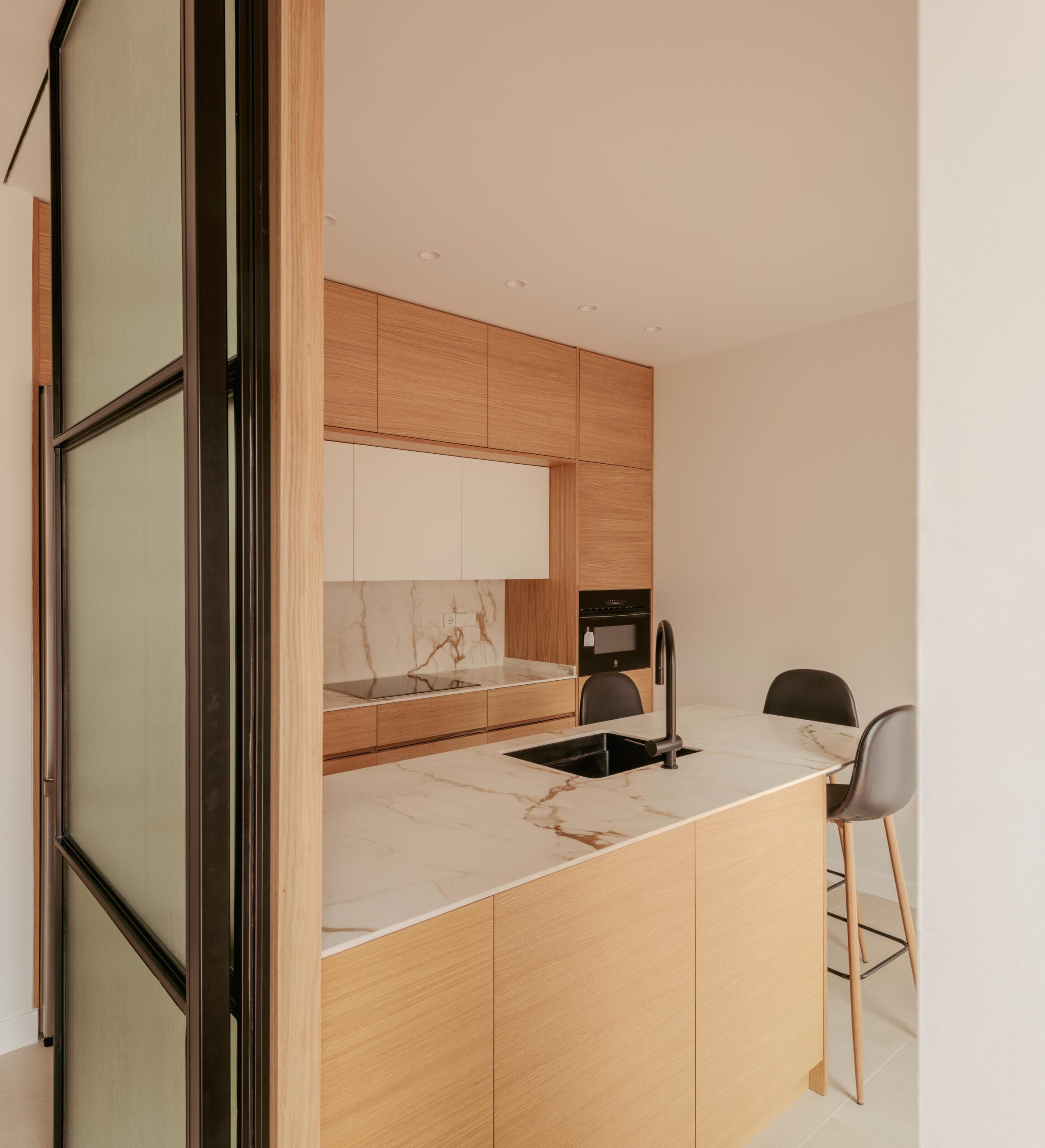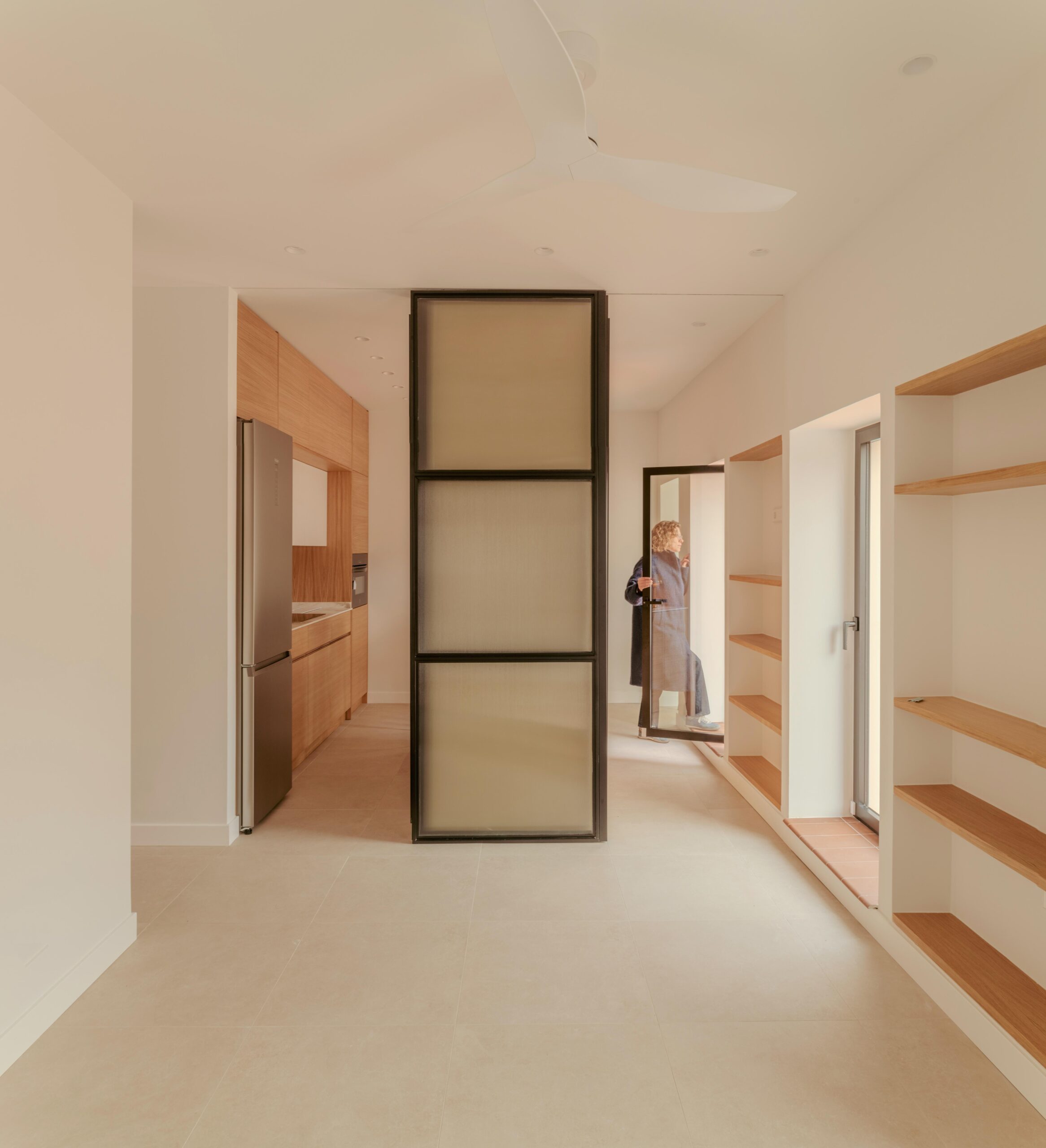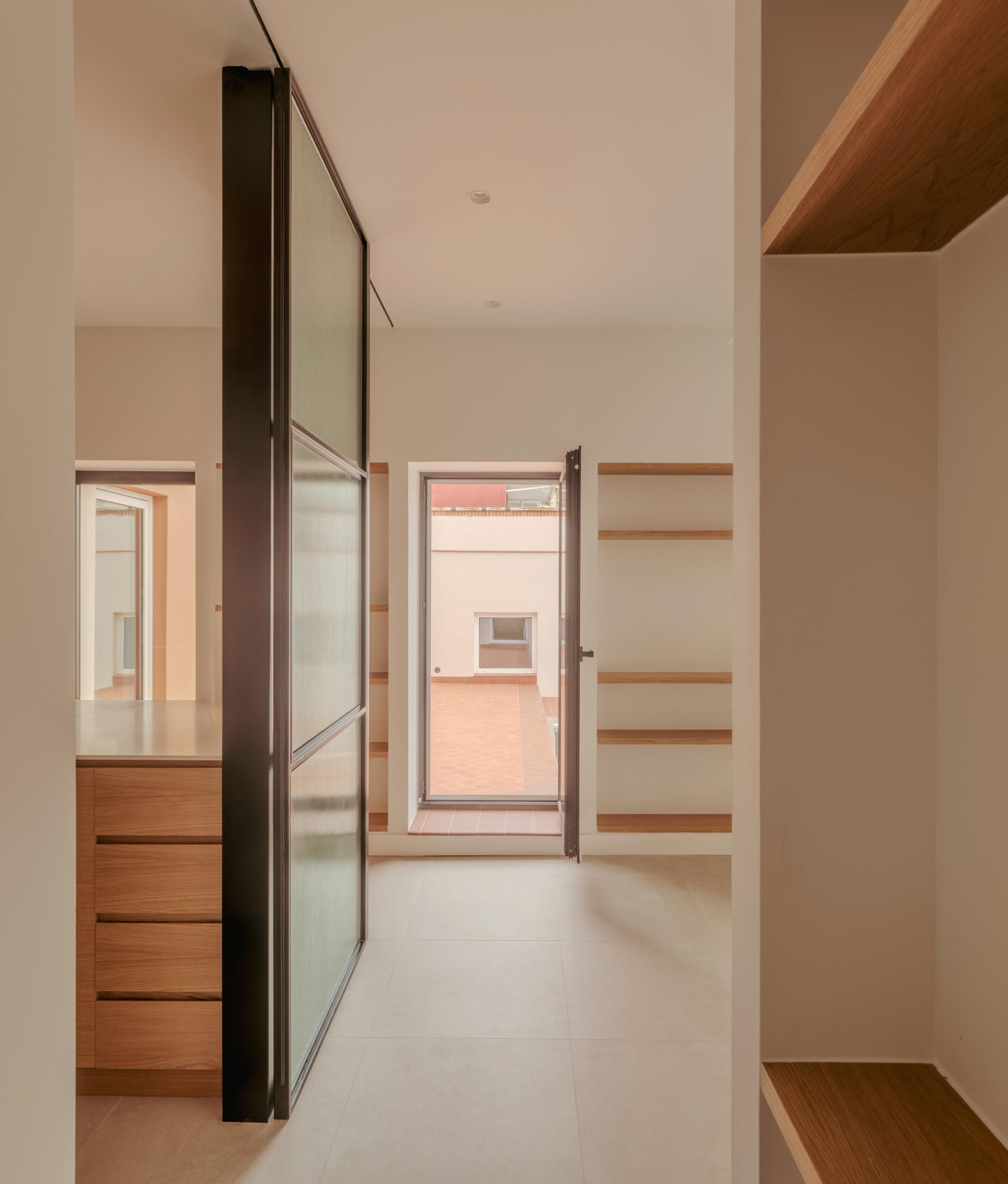 Escogiendo pocos materiales, conseguimos aunar criterios estéticos tanto en el interior como en el exterior, provocando la ilusión de obtener una vivienda más grande. La decisión de unir visualmente cocina, salón y comedor, dejando que la lectura de los huecos de la fachada del patio sea completa desde el interior, consigue dicho efecto.
