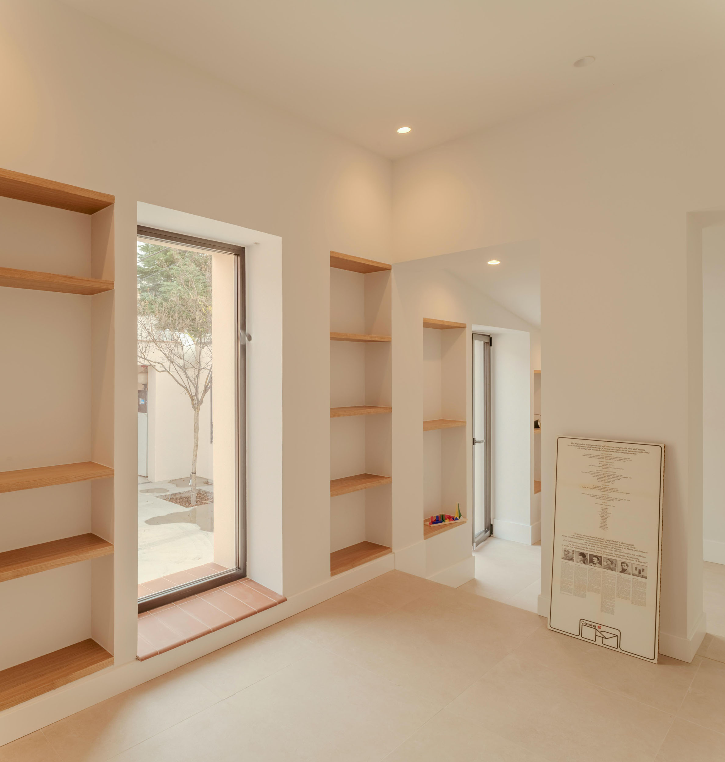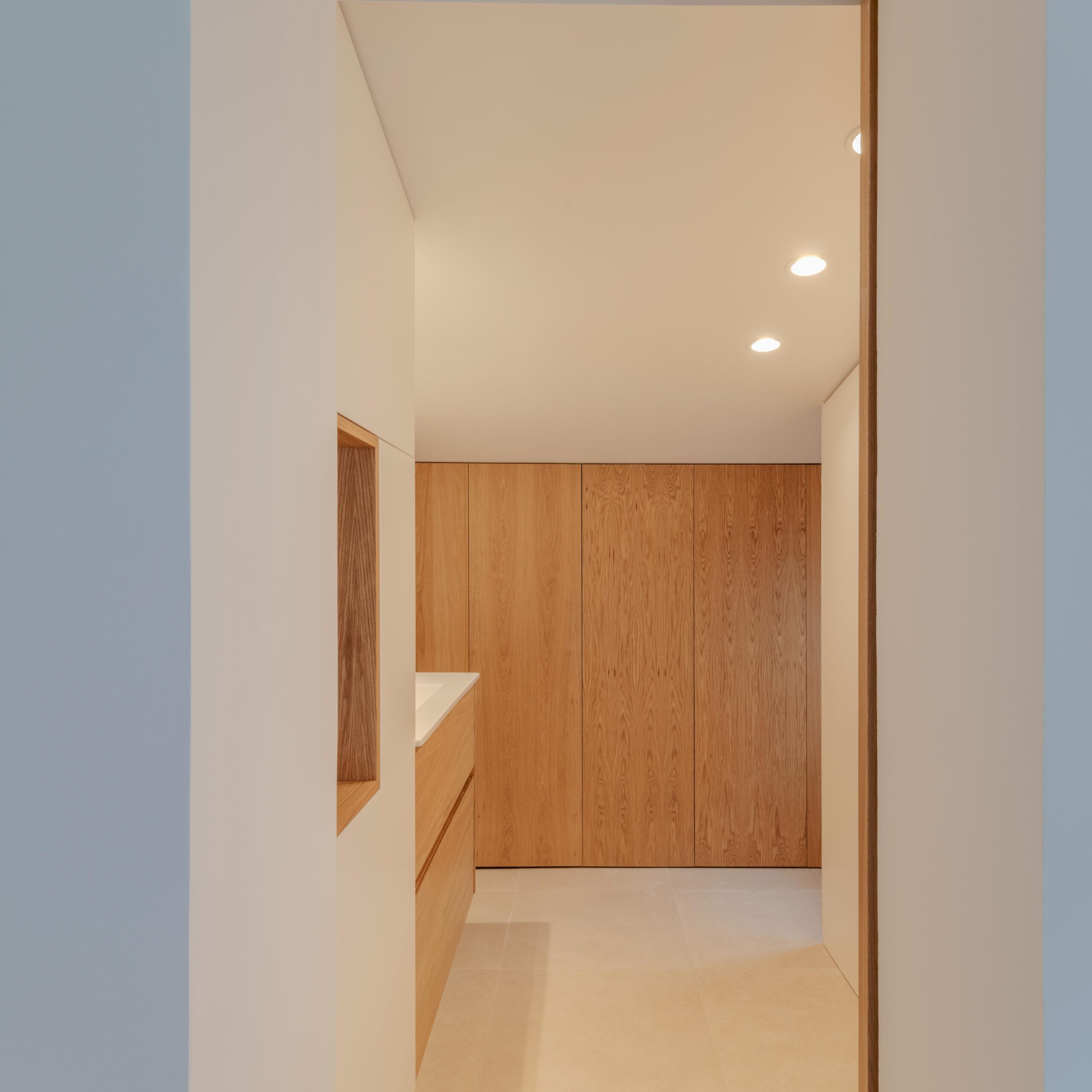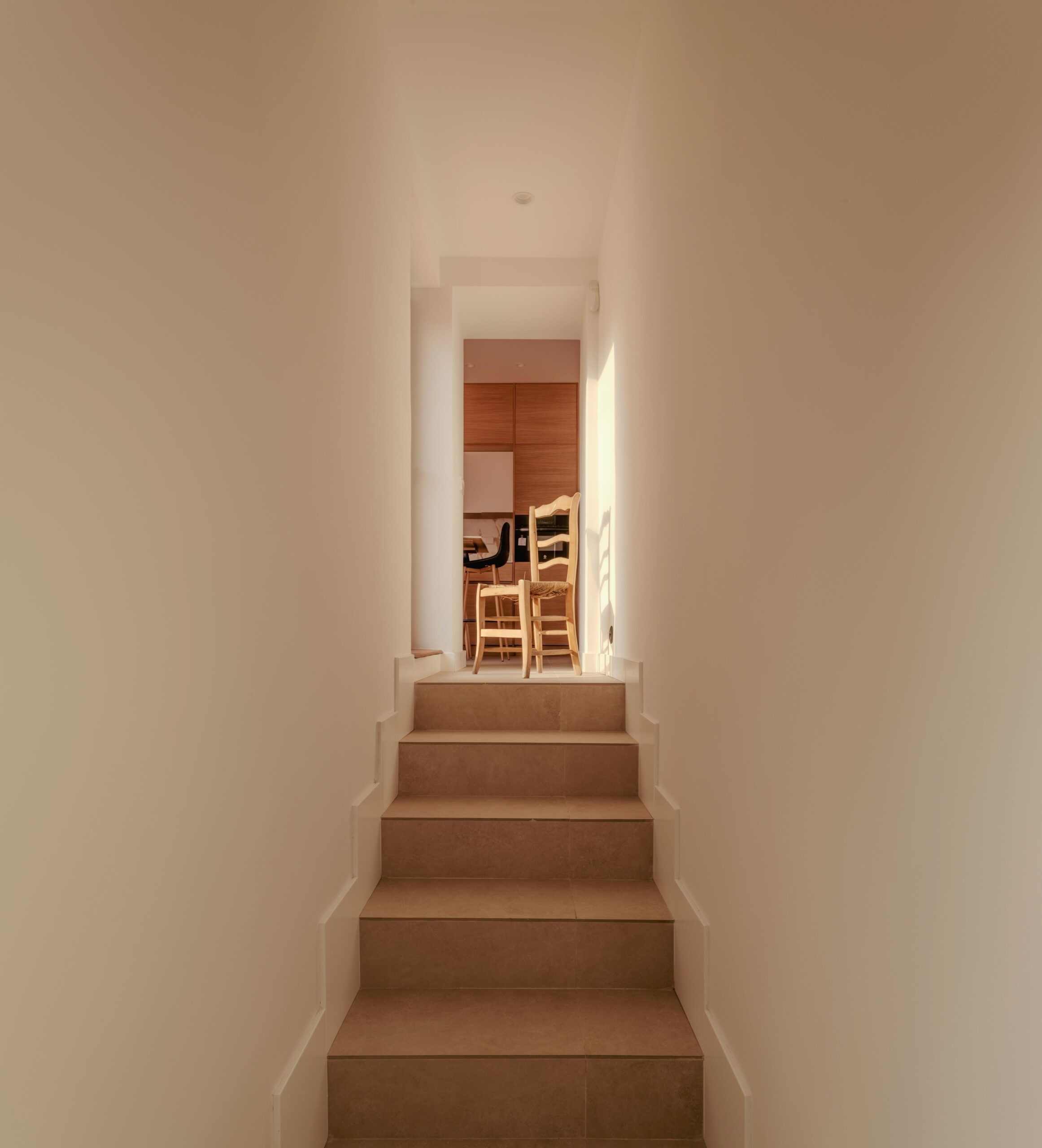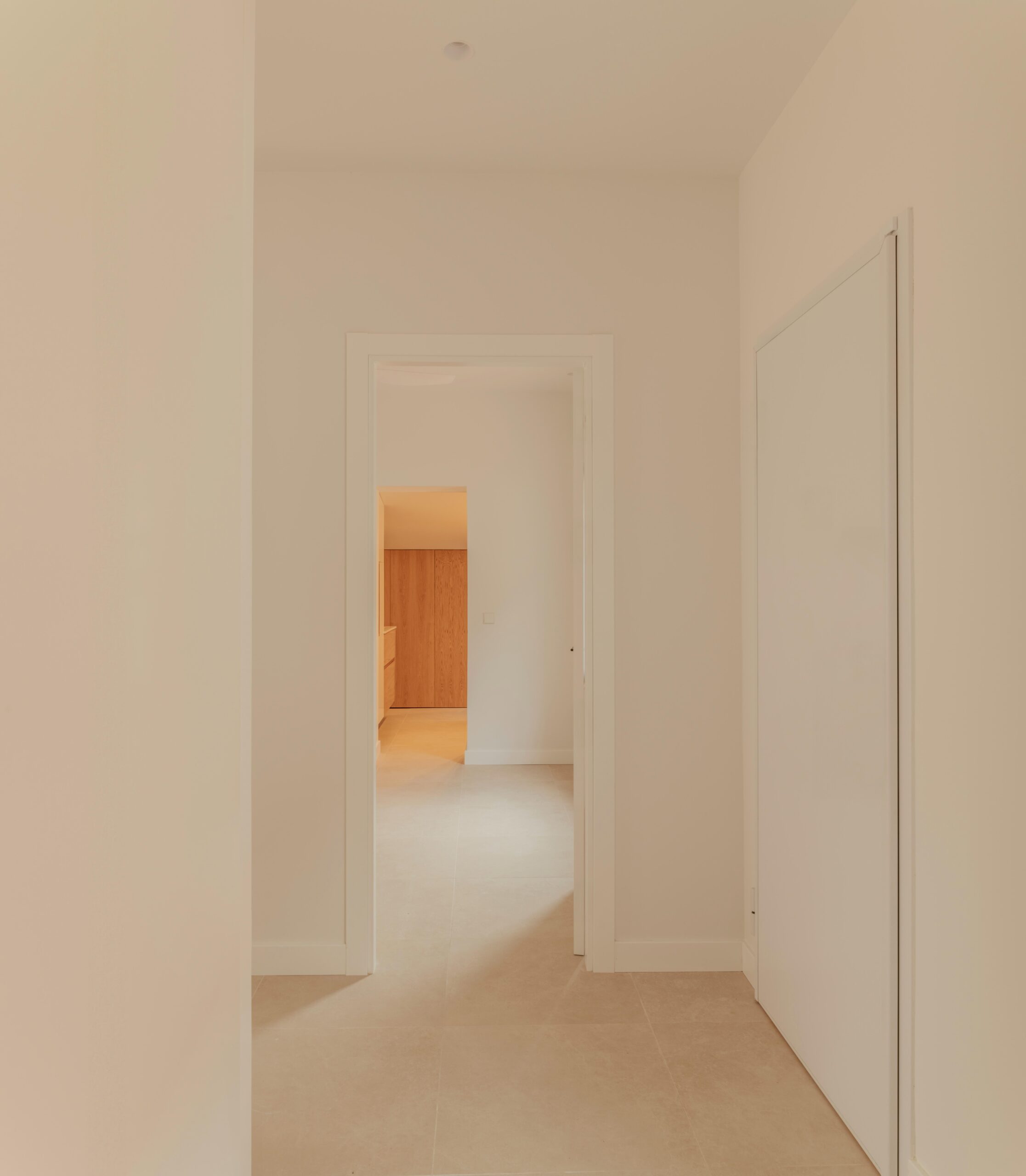 Escogiendo pocos materiales, conseguimos aunar criterios estéticos tanto en el interior como en el exterior, provocando la ilusión de obtener una vivienda más grande. La decisión de unir visualmente cocina, salón y comedor, dejando que la lectura de los huecos de la fachada del patio sea completa desde el interior, consigue dicho efecto.