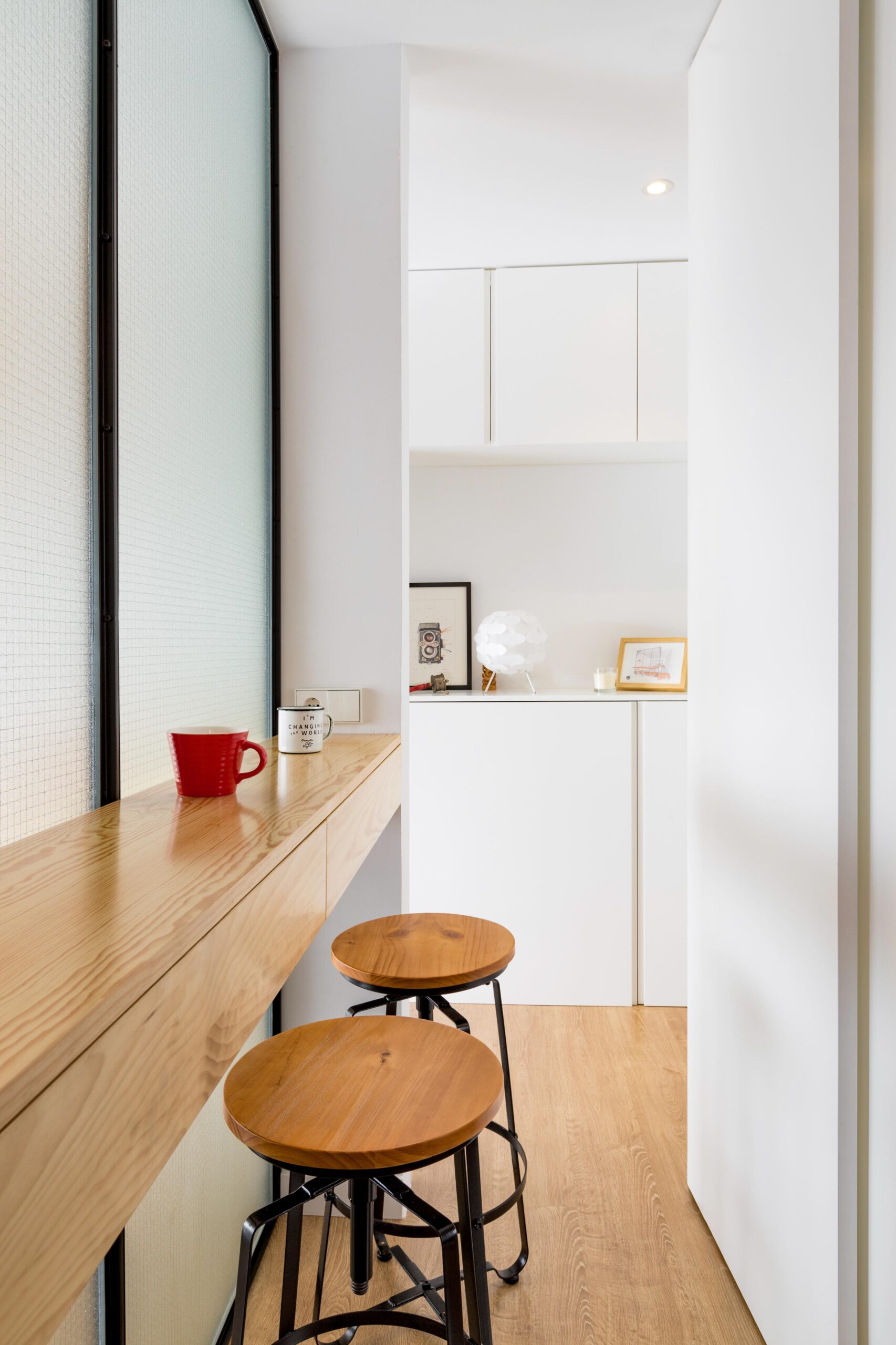La cocina se separa del salón mediante una mampara fija, que deja pasar la luz pero no la imagen de lo que sucede detrás, confiriendo la intimidad pretendida.