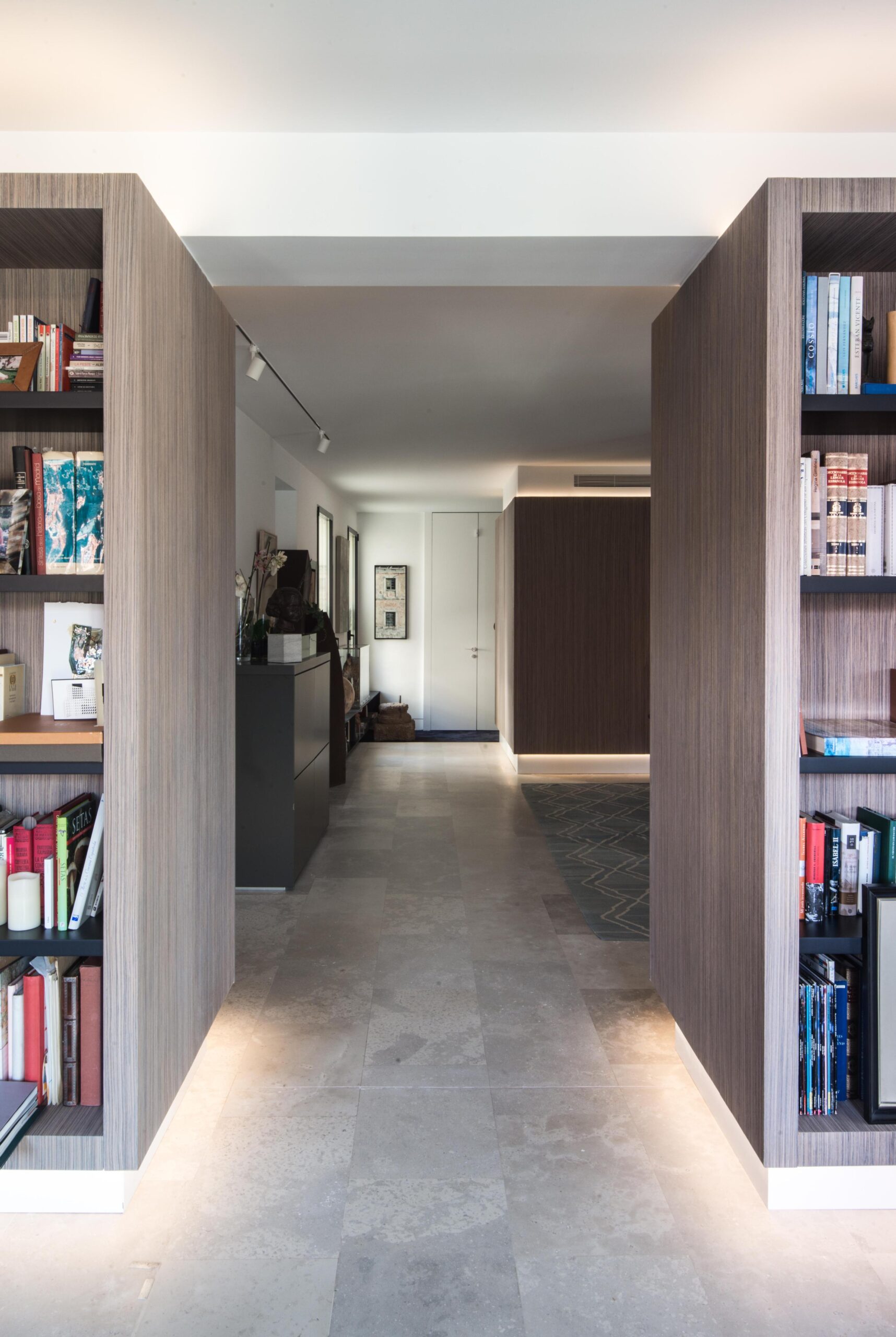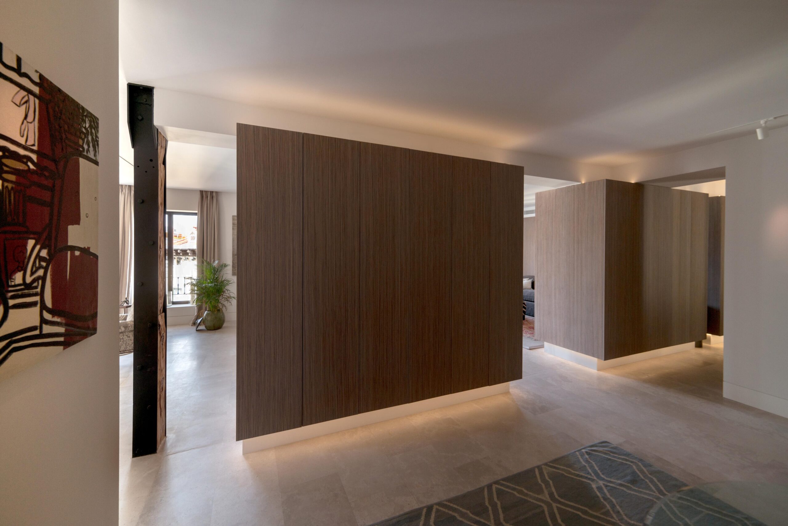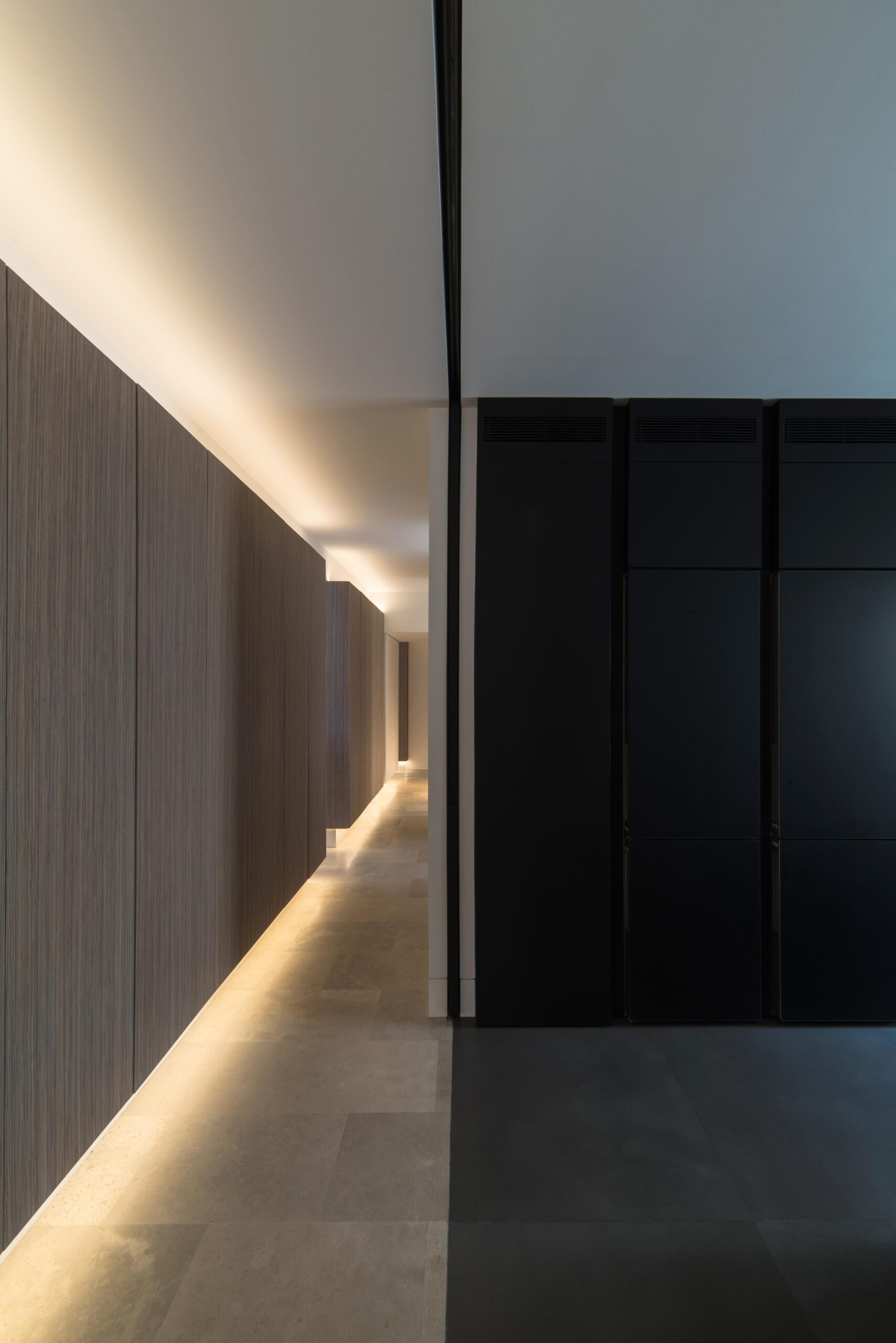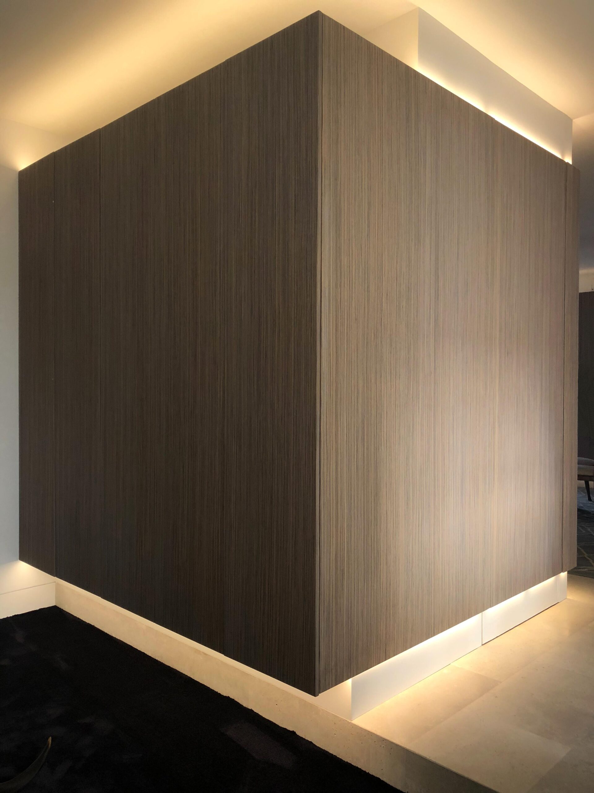 Todas las “cajas” se conforman con el mismo material, una preciosa madera veteada de Zebrano teñida de gris. Las lineas depuradas de cada box se potencian mediante el uso de la luz artificial indirecta y regulable en intensidad, que delimita su perímetro tanto por la parte inferior como por la superior de los volúmenes. Esto permite generar ambientes diferentes, desde una luz tenue que permite una velada tranquila, hasta una luz intensa, casi museística.