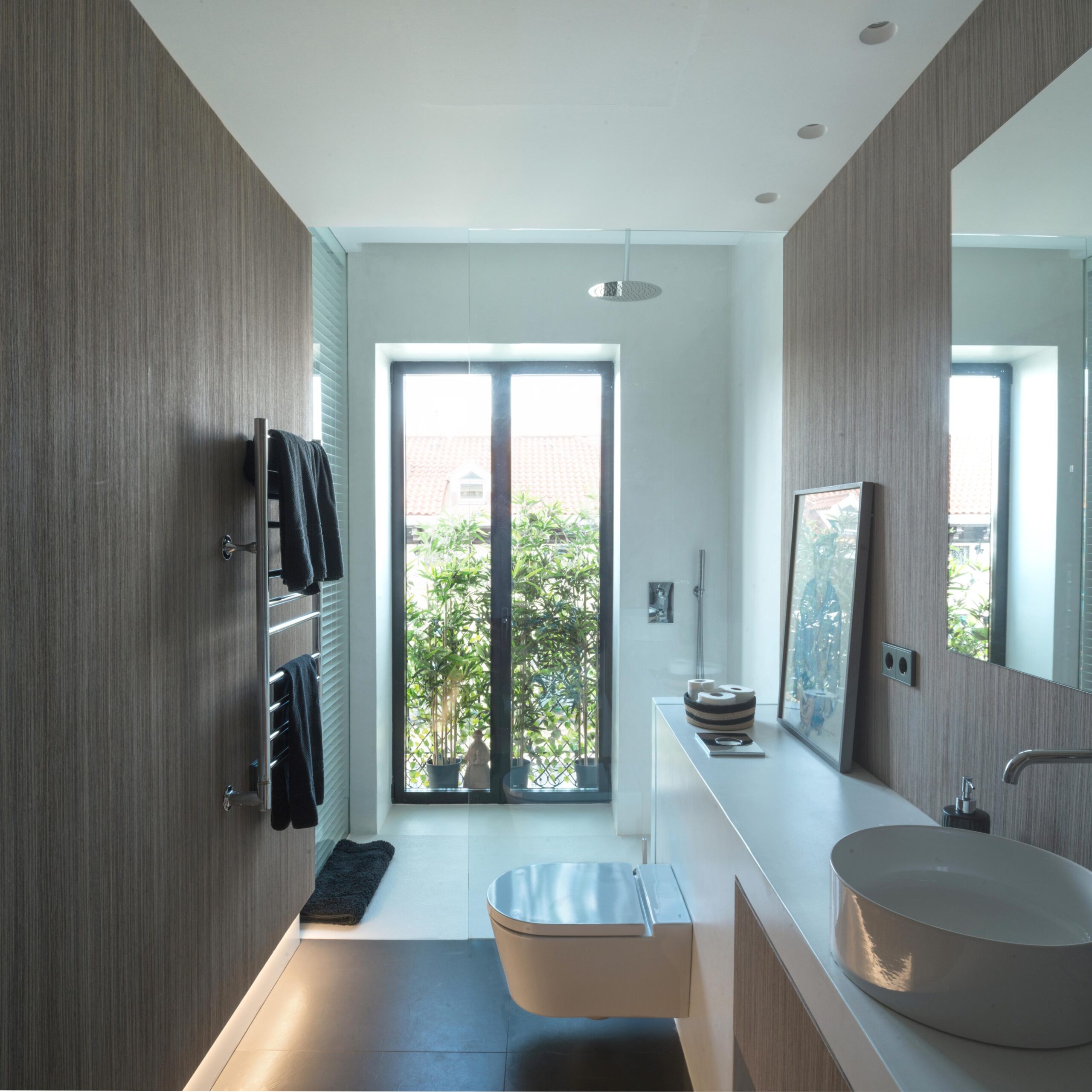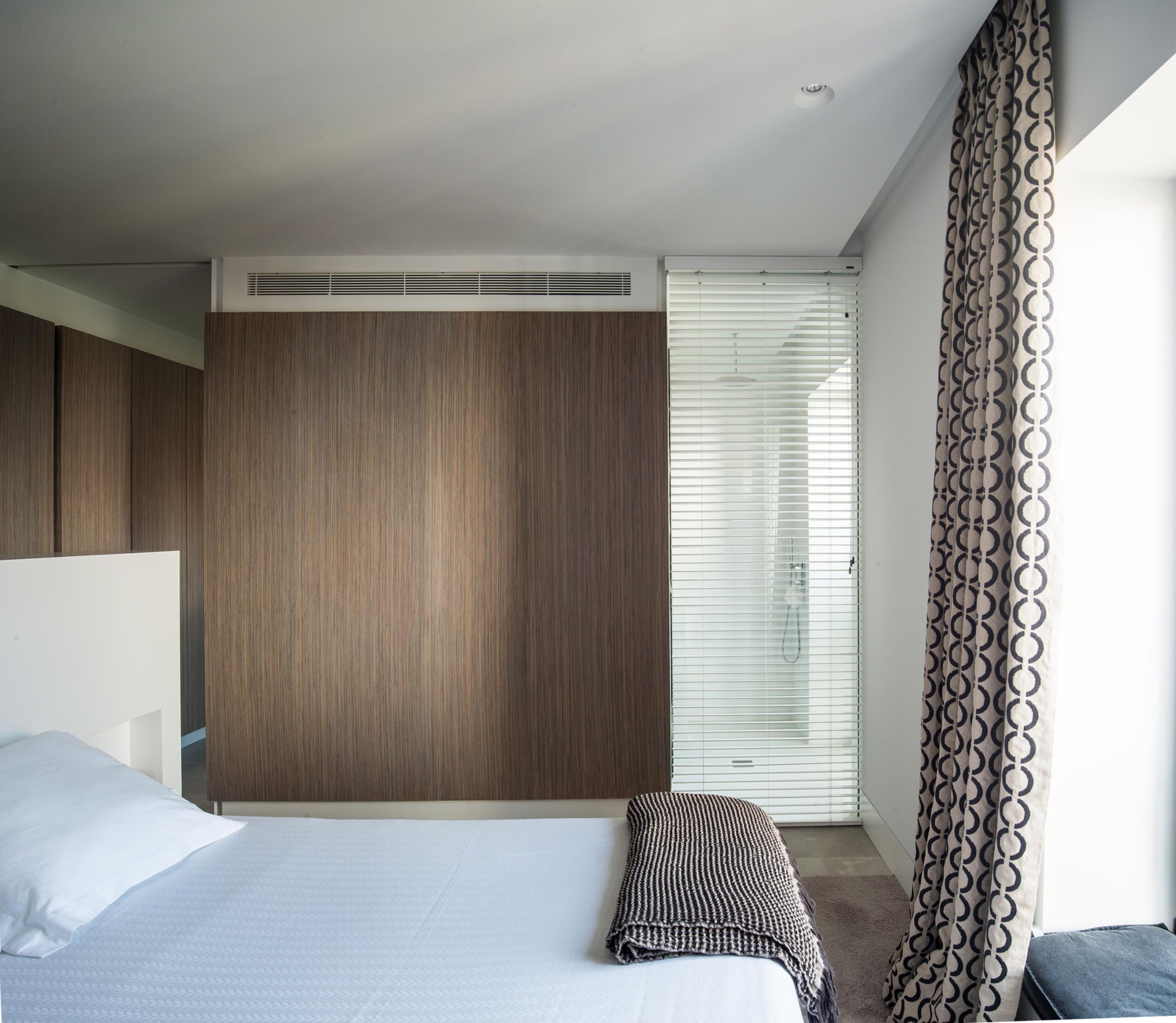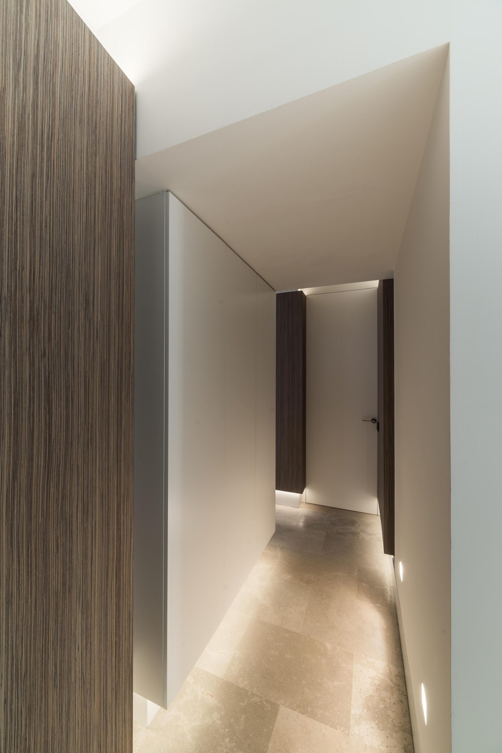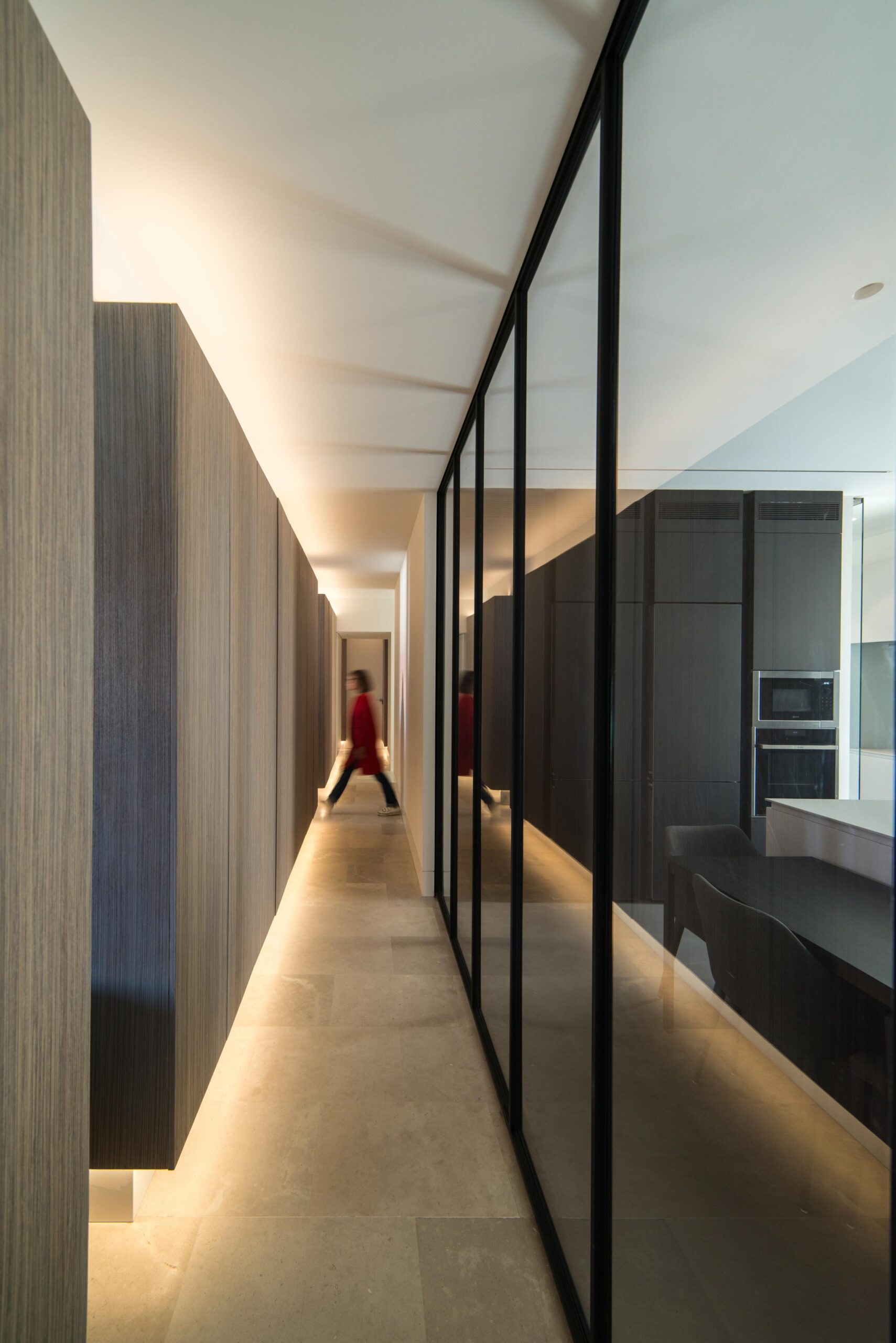 Todas las “cajas” se conforman con el mismo material, una preciosa madera veteada de Zebrano teñida de gris. Las lineas depuradas de cada box se potencian mediante el uso de la luz artificial indirecta y regulable en intensidad, que delimita su perímetro tanto por la parte inferior como por la superior de los volúmenes. Esto permite generar ambientes diferentes, desde una luz tenue que permite una velada tranquila, hasta una luz intensa, casi museística.