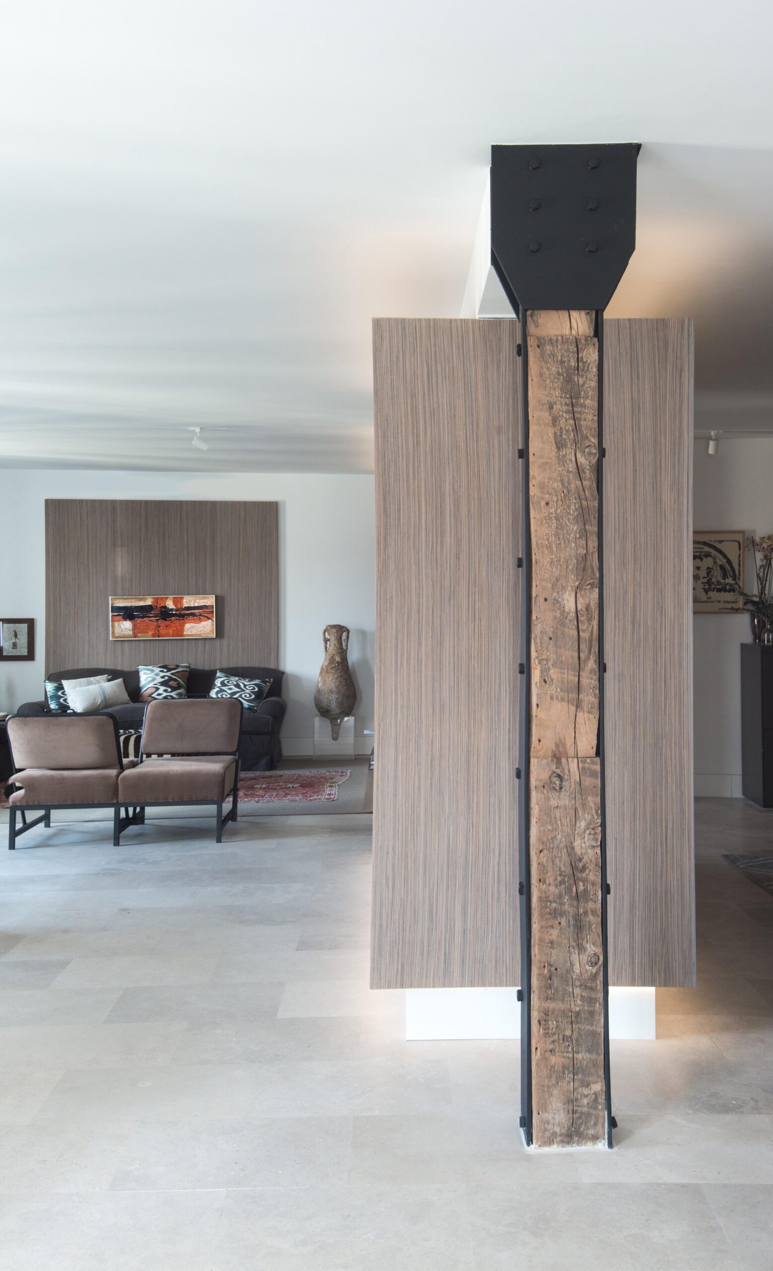 El suelo de piedra de Campaspero enmarca y pone en valor cada uno de los volúmenes gracias al contraste entre el gris claro y la madera.